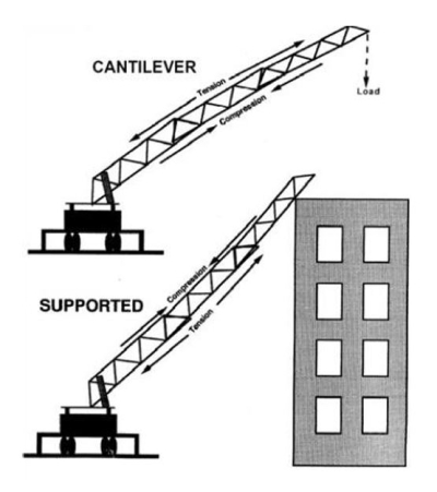 Though the design of old aerials required them to be supported against a building for maximum capacity, modern aerial devices are designed to be used as a cantilevered truss (unsupported). This places the bottom chord of the aerial in compression and the top chord in tension. When allowed to contact a structure, these forces are reversed and can result in catastrophic failure of the aerial device. Multiple LODD's have occurred when an aerial been supported or has come into contact with a building. The picture below from USFA illustrates the forces in aerial ladders.
