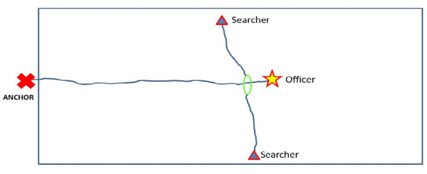 Maneuvering the far anchor point (officer spot) will take a little skill and thus some practice. Since the webbing bundle only gets the searcher 20’ from the reference line, it is possible in a large/open area search, the far anchor point must move so the searchers can cover the entire area. This may require that the exit anchor point also move such that a grid pattern is performed rather than a sweep pattern. When there is furniture, office cubicles, support columns, debris, etc. this can be difficult too impossible to conduct quickly or completely.